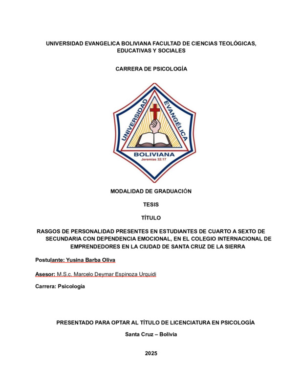 Rasgos de personalidad presentes en estudiantes de cuarto a sexto de secundaria con dependencia emocional, en el colegio Internacional de Emprendedores en la ciudad de Santa Cruz de la Sierra