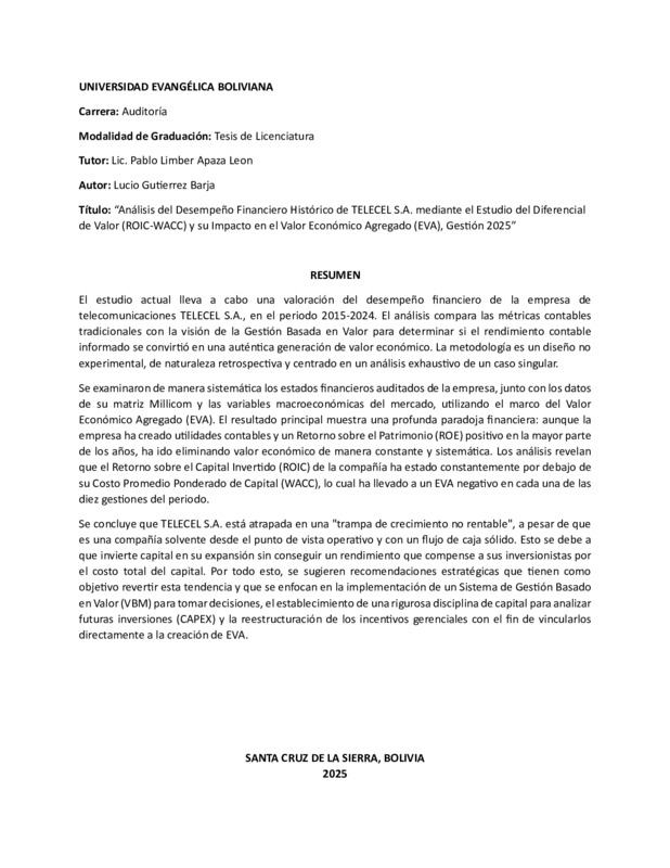 ANÁLISIS DEL DESEMPEÑO FINANCIERO HISTÓRICO DE TELECEL S.A. MEDIANTE EL ESTUDIO DEL DIFERENCIAL DE VALOR (ROIC-WACC) Y SU IMPACTO EN EL VALOR ECONÓMICO AGREGADO (EVA), GESTIÓN 2025