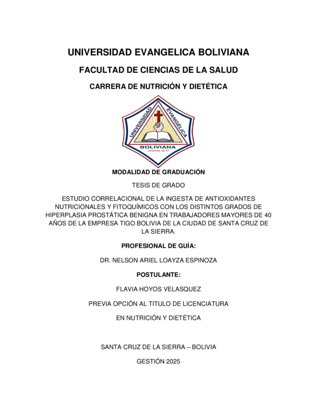 Estudio correlacional de la ingesta de antioxidantes nutricionales y fitoquímicos con los distintos grados de hiperplasia prostática benigna en trabajadores mayores de 40 años de la Empresa Tigo Bolivia de la ciudad de Santa Cruz de la Sierra.