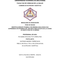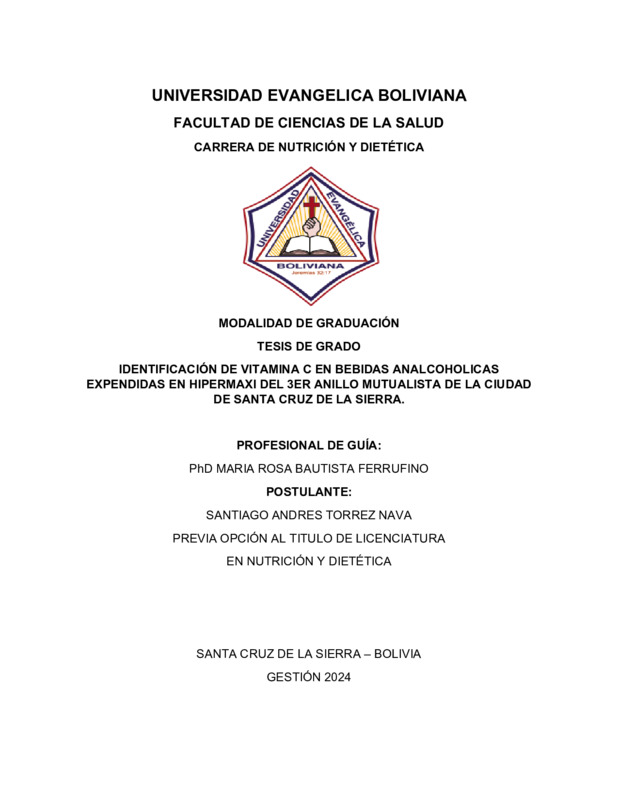 El presente trabajo de investigación tiene como objetivo analizar el contenido de vitamina C en bebidas analcohólicas embotelladas comercializadas en Santa Cruz de la Sierra, Bolivia, y evaluar si el valor coincide con el declarado en el etiquetado nutricional. La vitamina C, también conocida como ácido ascórbico, es un nutriente esencial con funciones antioxidantes, inmunológicas y estructurales, cuya estabilidad se puede ver afectada por factores como la exposición a la luz, al oxígeno, al calor o al pH. Estas condiciones son comunes durante el procesamiento, transporte y almacenamiento, y pueden provocar una
